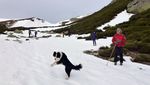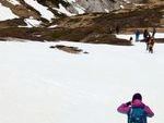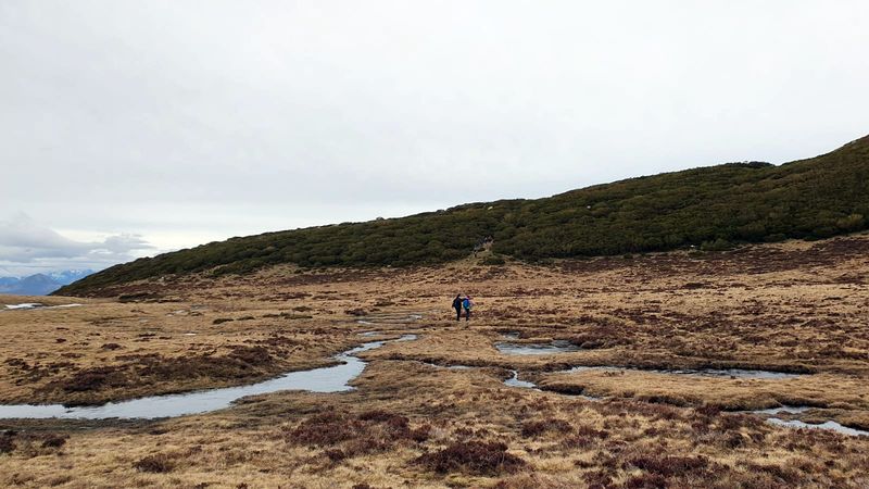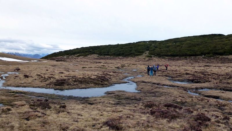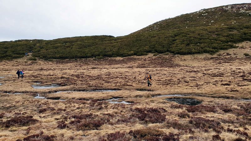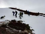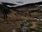 Quince personas y Zar salimos de Golobar a las 9:20 de la mañana. Subimos a buen ritmo y cuarenta minutos después ya cruzamos el Portillo de Seldelafuente. Bajamos hacia el arroyo rápido, huyendo del viento que enseguida dejó de molestar.